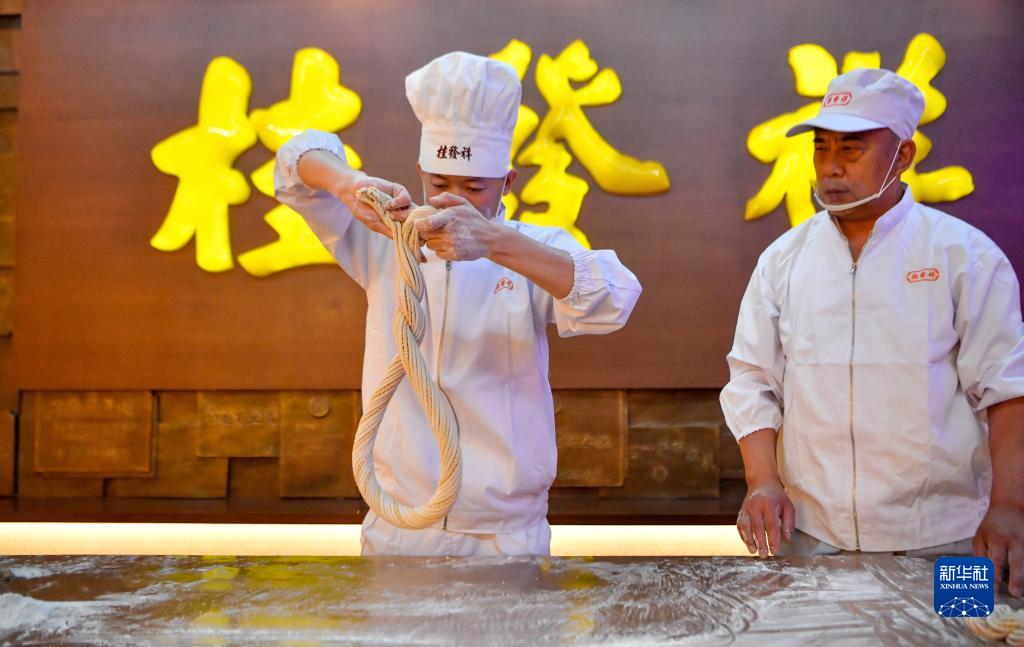 在天津桂發(fā)祥十八街麻花文化館,徒弟趙寶陽(yáng)在王洪德(右)的指導下搓制手工麻花(6月8日攝)。