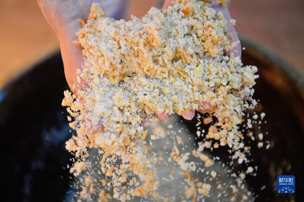 在天津桂發(fā)祥十八街麻花文化館,趙寶陽(yáng)為手工麻花制作準備餡料(6月8日攝)。