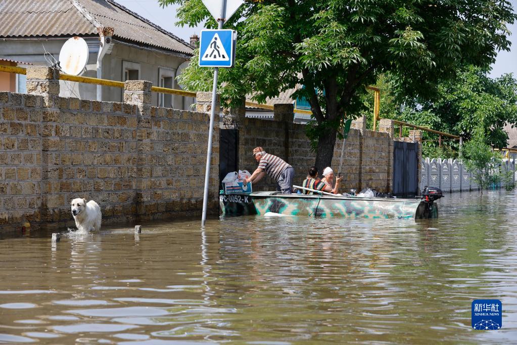 6月8日,人們乘船經(jīng)過(guò)赫爾松州被洪水淹沒(méi)的地區。