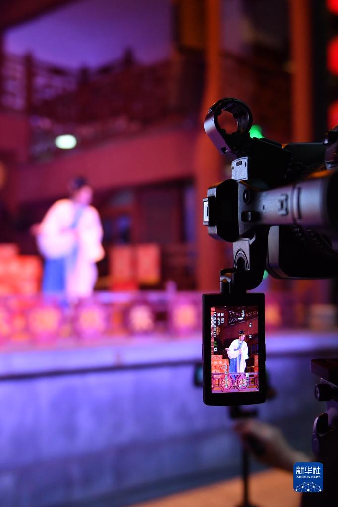 6月5日,在長(cháng)沙市坡子街火宮殿,長(cháng)沙市花鼓戲保護傳承中心的演出正在直播