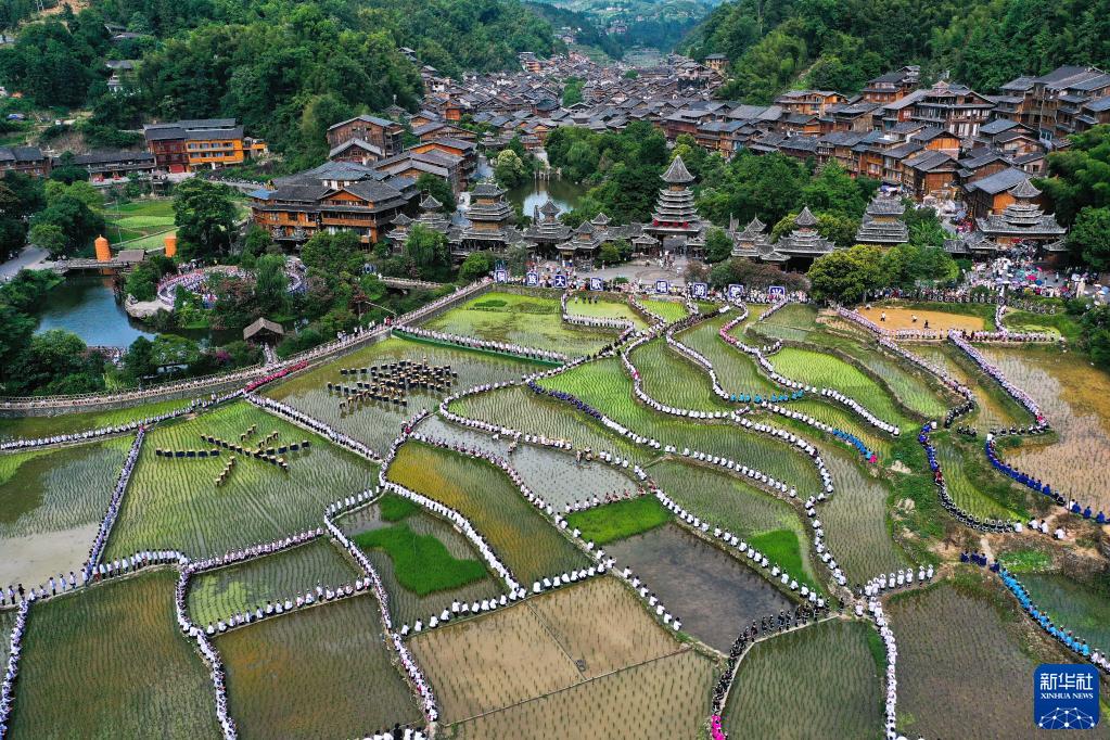 6月10日,在貴州省黔東南苗族侗族自治州黎平縣肇興侗寨,以侗寨作背景,以田園為舞臺,來(lái)自黔東南州各縣市的歌手與現場(chǎng)游客、群眾約萬(wàn)人合唱侗族大歌等歌曲,展示人類(lèi)非物質(zhì)文化遺產(chǎn)之美。