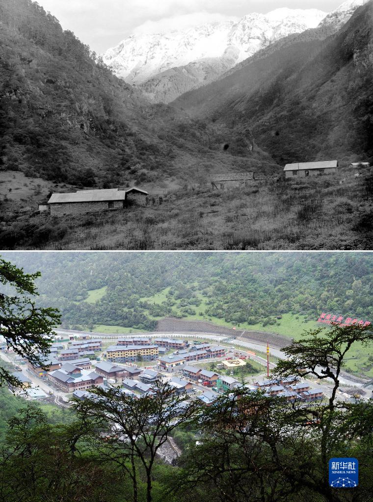 這是一張拼版照片。上圖為1997年9月拍攝的玉麥鄉(新華社記者索朗羅布攝);下圖為2023年6月10日拍攝的玉麥鄉(新華社記者費茂華攝)。