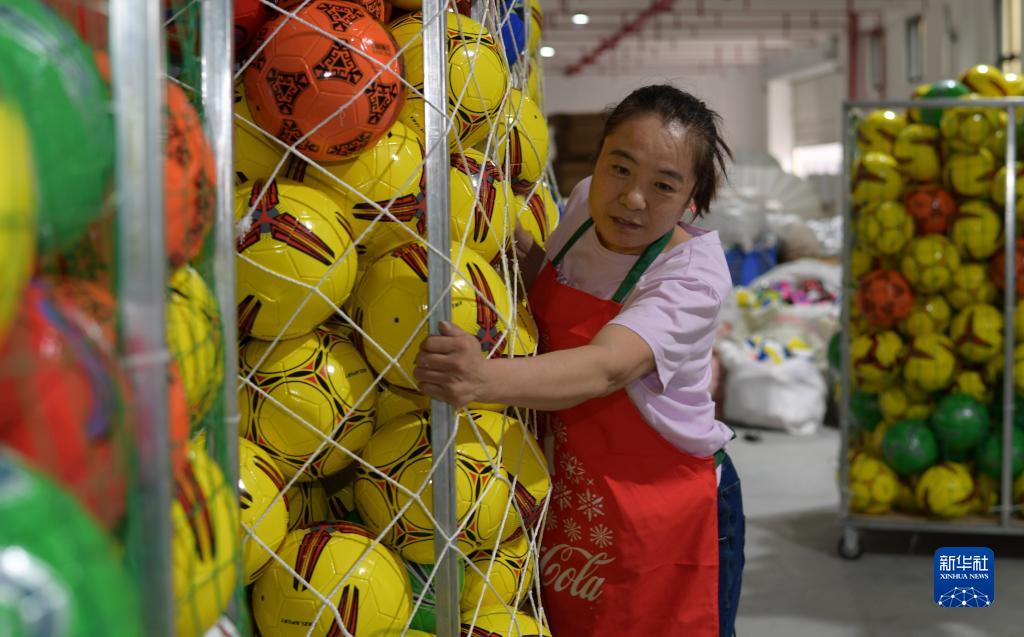 6月12日,工人在鳳岡縣一足球生產(chǎn)企業(yè)搬運成品足球。