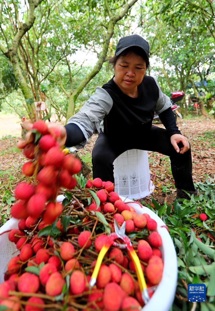 6月12日,在廣東茂名高州市根子鎮柏橋村荔枝種植園,一位果農整理剛剛采摘的荔枝。
