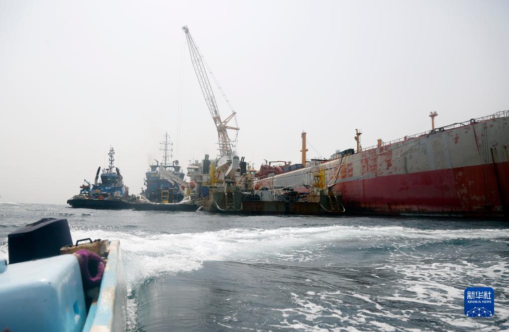 這是6月12日在也門(mén)荷臺達附近海域拍攝的“薩菲爾”號油輪和聯(lián)合國工程船。