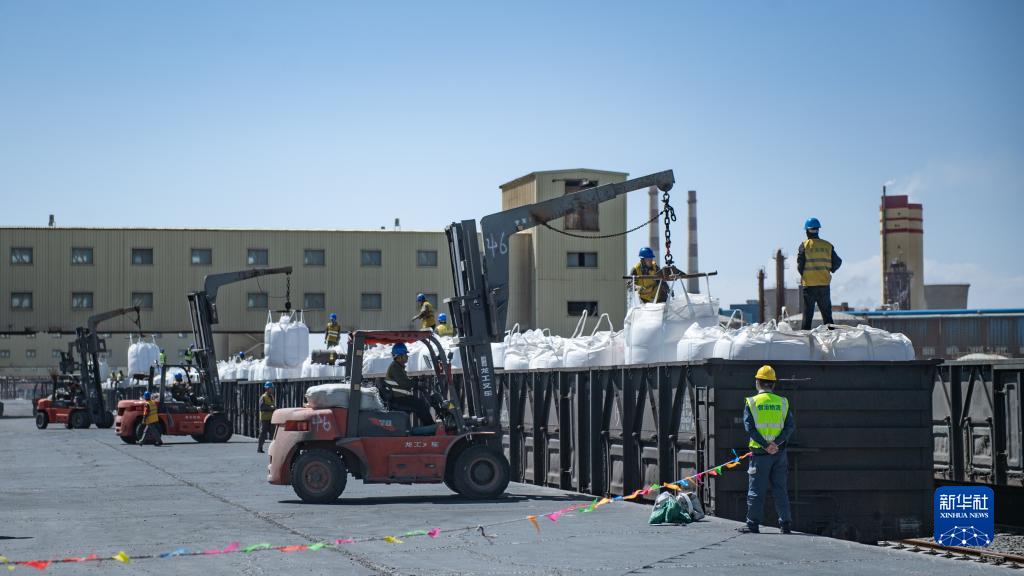 6月12日,在青海鹽湖工業(yè)股份有限公司鉀肥分公司貨場(chǎng),工作人員在裝運鉀肥。