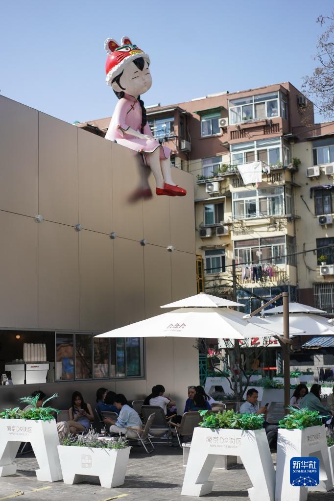 在位于玄武區的南京D9街區,市民在一家咖啡館休閑放松(2022年4月8日攝)。D9街區是玄武區利用都市工業(yè)遺存打造的文旅消費項目。