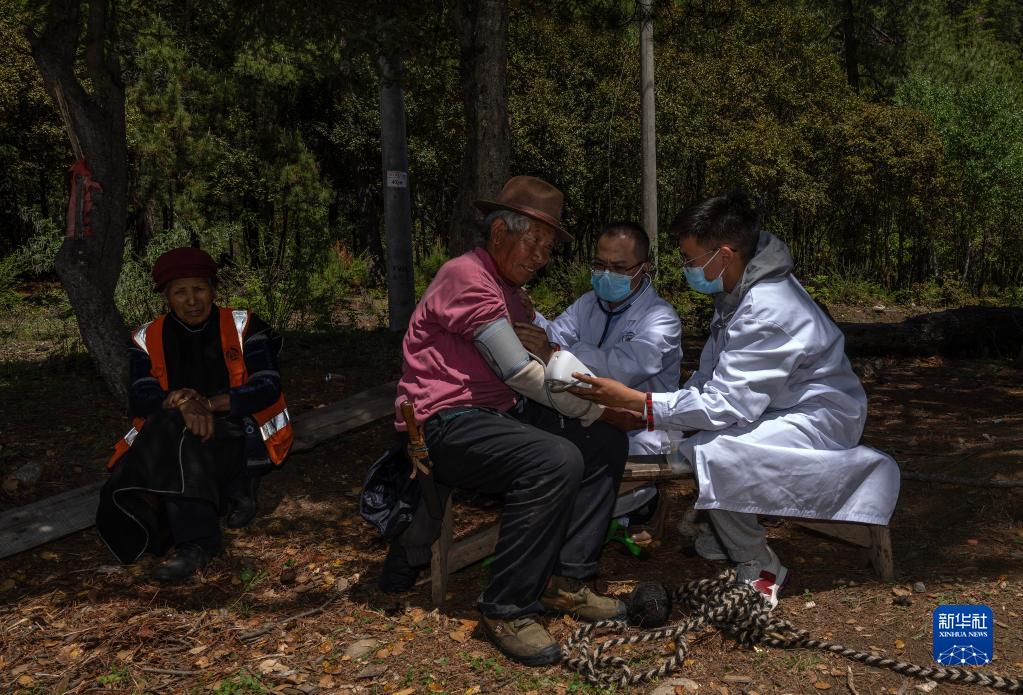 返程的途中,又有兩位老人攔住了汽車(chē),他們得知當天送醫上門(mén)的消息,便等候在離村幾公里的地方。于是,在路邊的樹(shù)下,王振疆醫生又帶著(zhù)尼瑪益西為兩位老人進(jìn)行了診療。