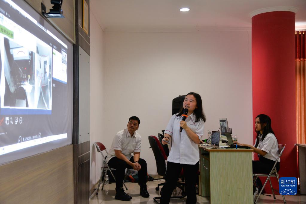 3月20日,在位于印度尼西亞茉莉芬市的印尼鐵路理工學(xué)院,中國員工劉淑媛(中)在雅萬(wàn)高鐵首批運維人員培訓班上擔任翻譯。