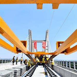 6月14日,在濟鄭高鐵山東段長(cháng)清黃河特大橋,中鐵十局的工作人員進(jìn)行鐵軌鋪設作業(yè)(無(wú)人機照片)。