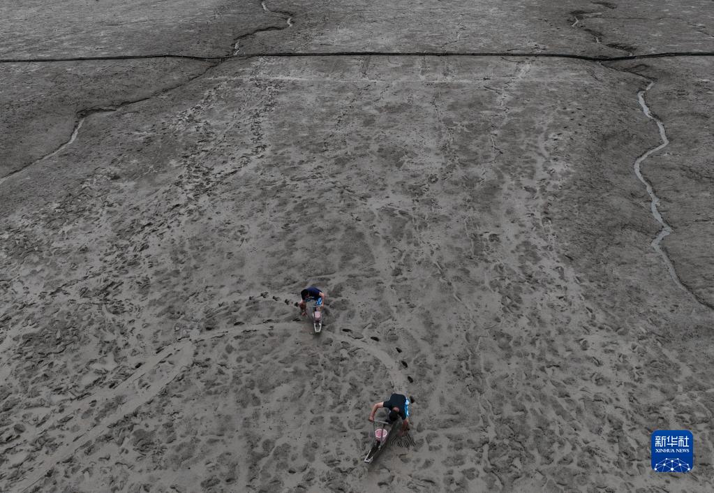 6月14日,游客在蛇蟠島的一片灘涂上體驗滑泥項目(無(wú)人機照片)。