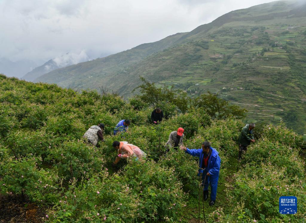 6月14日,在四川省阿壩州小金縣新橋鄉共和村,當地種植戶(hù)在采摘玫瑰鮮花。