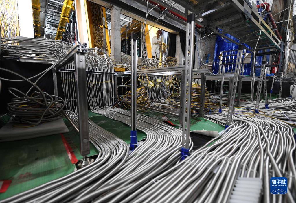 6月15日,工作人員在江門(mén)中微子實(shí)驗地下大廳內布線(xiàn)。