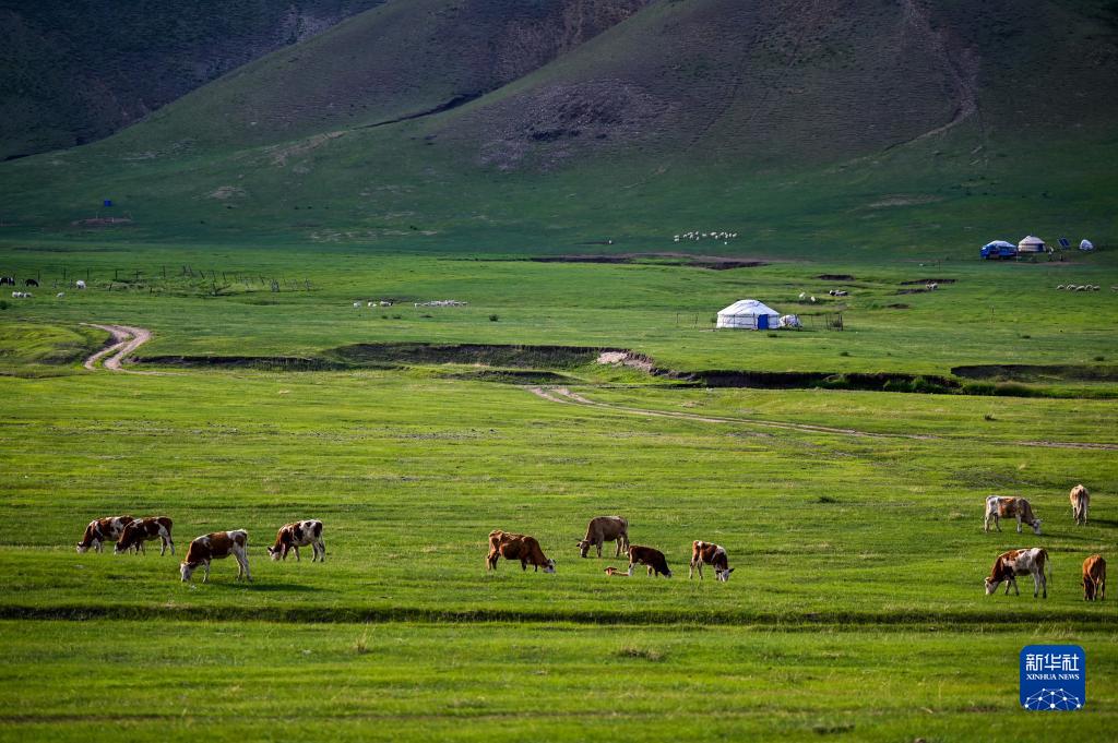 內蒙古赤峰市阿魯科爾沁草原游牧系統核心區總面積500萬(wàn)畝,南連大興安嶺,西接錫林郭勒大草原,是天然的優(yōu)良牧場(chǎng)。眼下,阿魯科爾沁旗巴彥溫都爾蘇木的夏牧場(chǎng)迎來(lái)放牧黃金季節,綠色草原綿延不絕,在牛羊、氈房的點(diǎn)綴下更加多姿多彩。