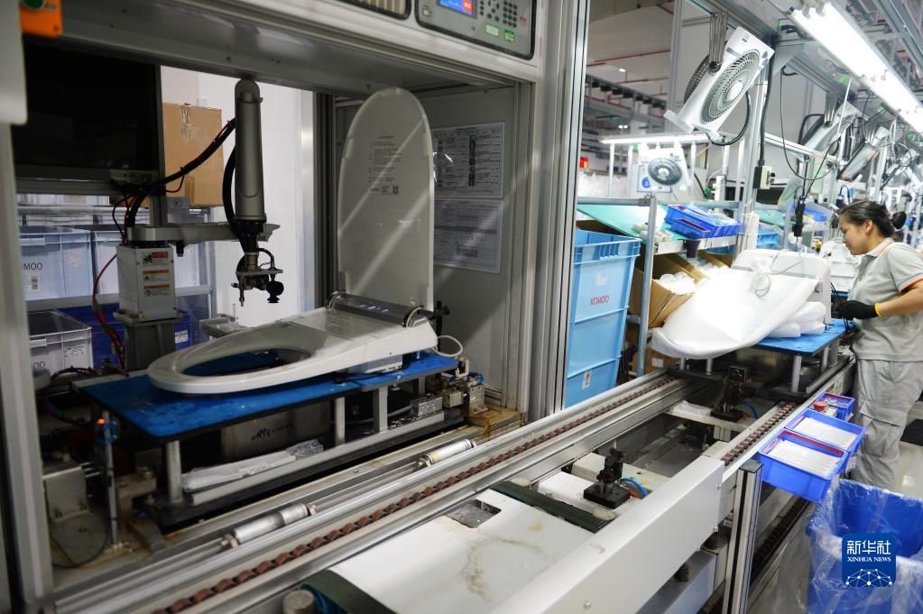 6月17日,在位于福建泉州南安市的九牧智能馬桶燈塔工廠(chǎng),工人在5G智能化車(chē)間工作。該車(chē)間采用光伏發(fā)電、節水降耗等手段,實(shí)現低碳生產(chǎn)。