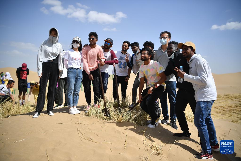 6月16日,留學(xué)生在寧夏靈武市白芨灘國家級自然保護區拍照合影。新華社記者 王鵬 攝