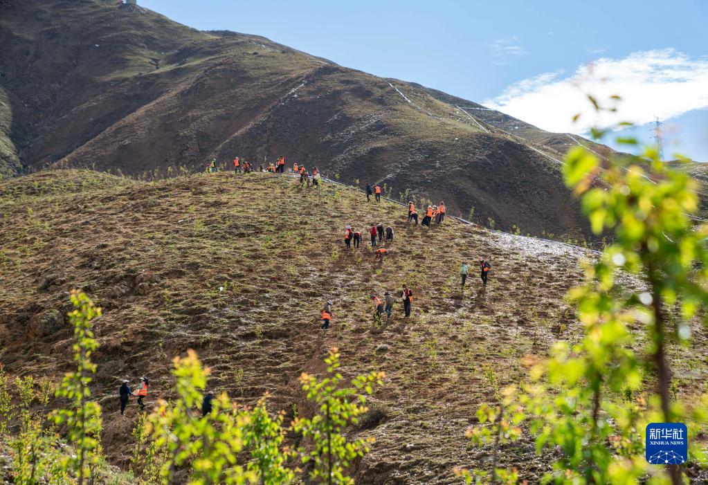 工人們在拉薩市城關(guān)區次角林村附近的山上播種造林(6月18日攝)。