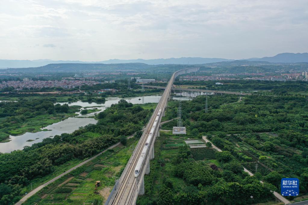 列車(chē)在杭臺高鐵位于浙江嵊州境內的路段行駛(6月19日攝,無(wú)人機照片)。