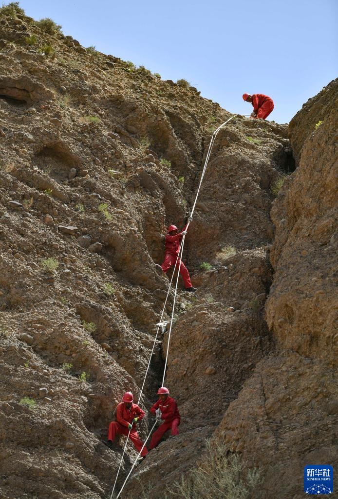 東方物探公司塔里木物探處2170隊的鉆工們借助繩索搬運鉆井設備,翻越一處落差約30米的崖壁(6月18日攝)。新華社記者 胡虎虎 攝