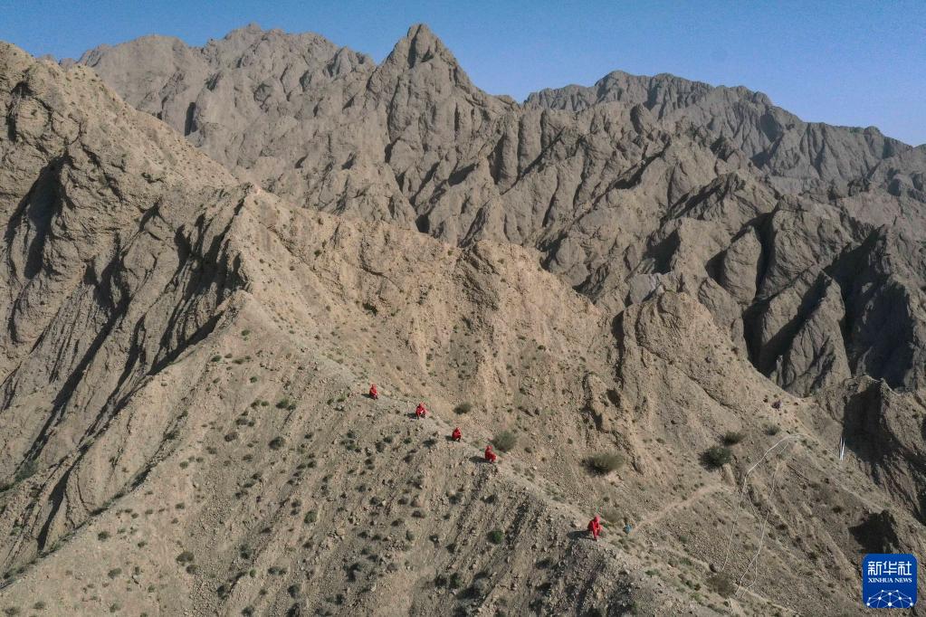 東方物探公司塔里木物探處2170隊鉆井組的工人在山間休息(6月18日攝,無(wú)人機照片)。新華社記者 胡虎虎 攝
