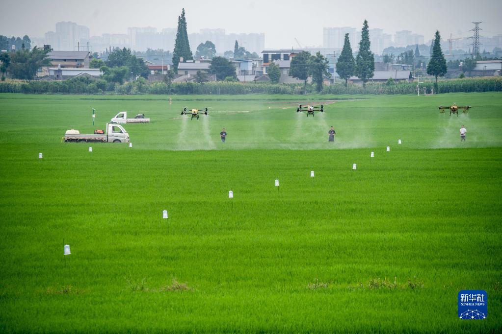 6月20日,在四川省眉山市彭山區公義鎮欣榮村水稻種子生產(chǎn)基地,農機員開(kāi)展植保無(wú)人機病蟲(chóng)害綜合防治作業(yè)(無(wú)人機照片)。