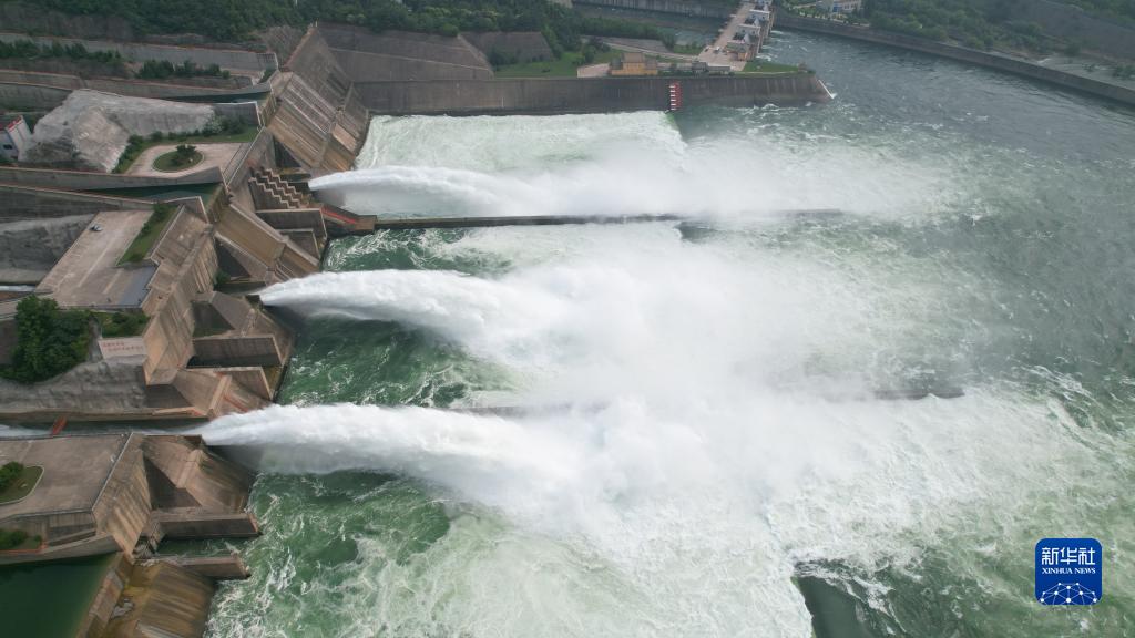 黃河小浪底水利樞紐開(kāi)啟3個(gè)閘門(mén)大流量下泄(6月21日攝,無(wú)人機照片)。