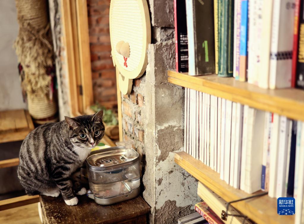 “愛(ài)看書(shū)”的貓咪“故知”在書(shū)架旁喝水(6月19日攝)。