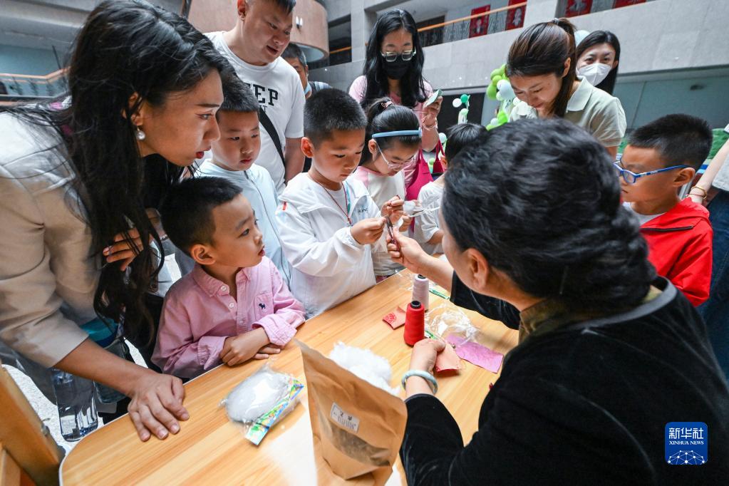 6月21日,陳玉秋在吉林市博物館教小朋友縫制端午節香囊。
