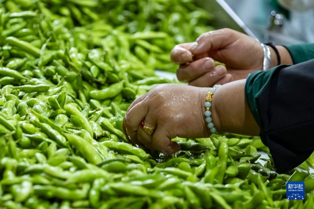 6月19日夜間,在四川省成都市金堂縣官倉綜合(果蔬)市場(chǎng)的流水線(xiàn)上,工人在篩選不符合外銷(xiāo)要求的毛豆。