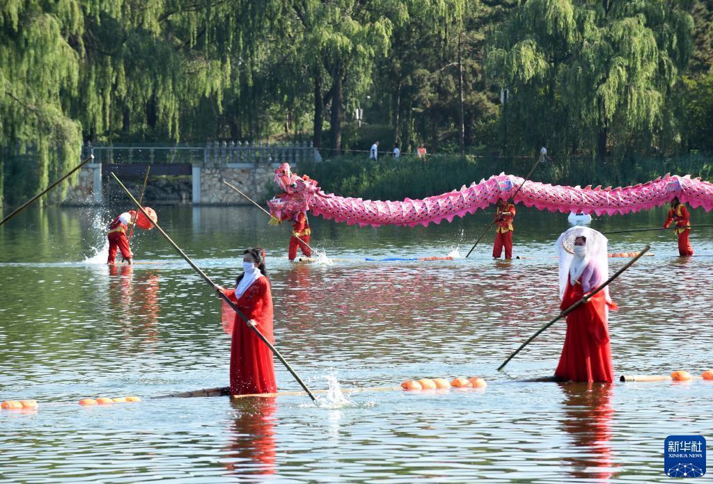 6月22日,獨竹漂表演者在北京圓明園九州景區的后湖進(jìn)行水上表演。