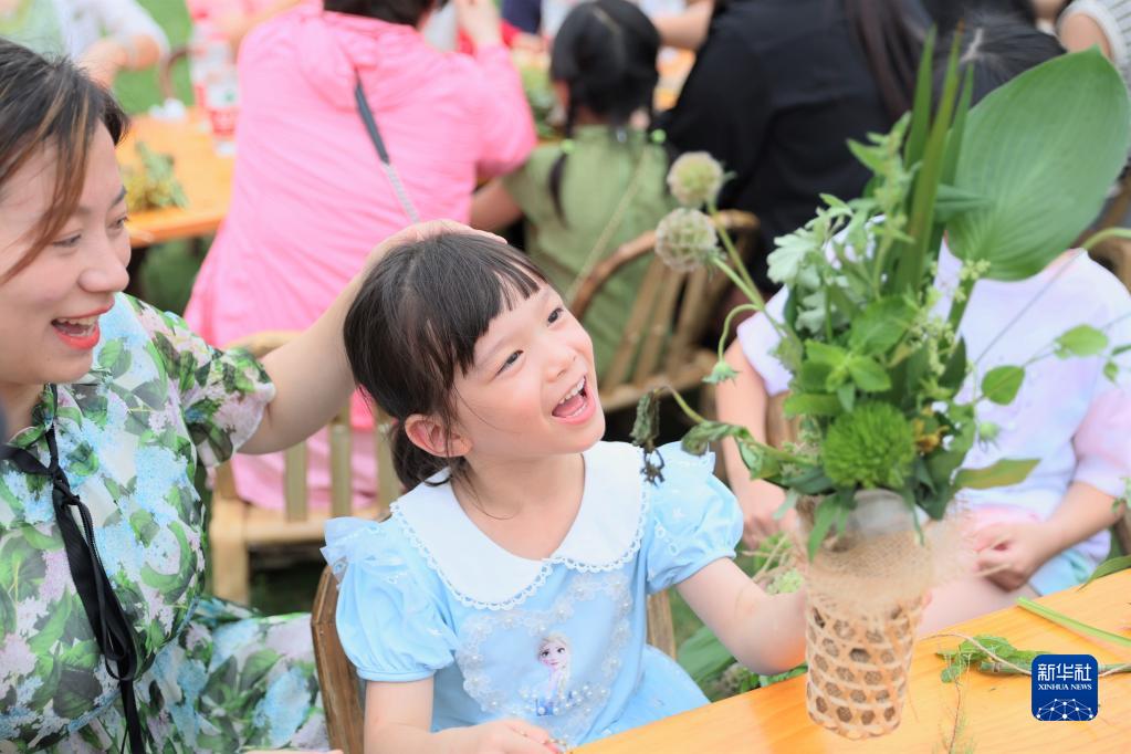 6月22日,小朋友在上海市閔行區華漕鎮舉行的端午活動(dòng)上展示制作好的艾草小提籃。
