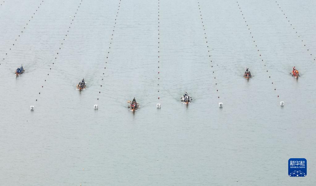 6月23日,在江蘇省泰州市水上運動(dòng)訓練基地,人們參加龍舟比賽(無(wú)人機照片)。