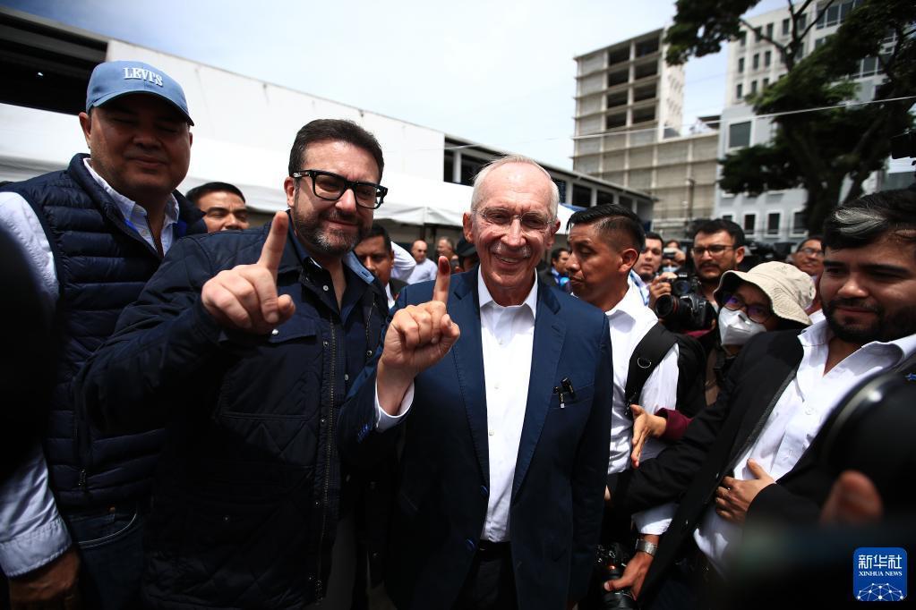 6月25日,曾擔任聯(lián)合國前秘書(shū)長(cháng)潘基文辦公室主任的“Cabal”黨候選人埃德蒙·穆萊特(左三)在危地馬拉首都危地馬拉城一處投票站參加投票。