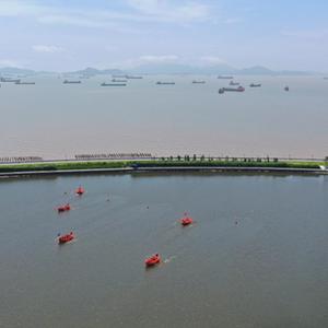6月26日,參賽隊員在浙江舟山長(cháng)峙島攬月湖參加水上操艇比賽。