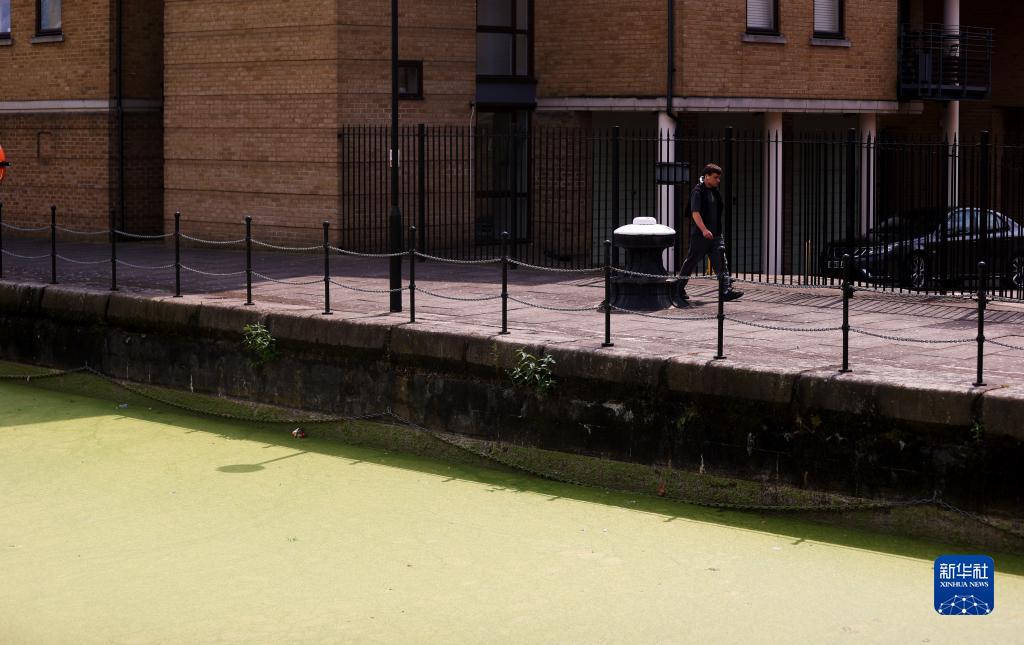由于當地氣溫升高等原因,英國倫敦泰晤士河畔碼頭的一處水域被浮萍覆蓋。