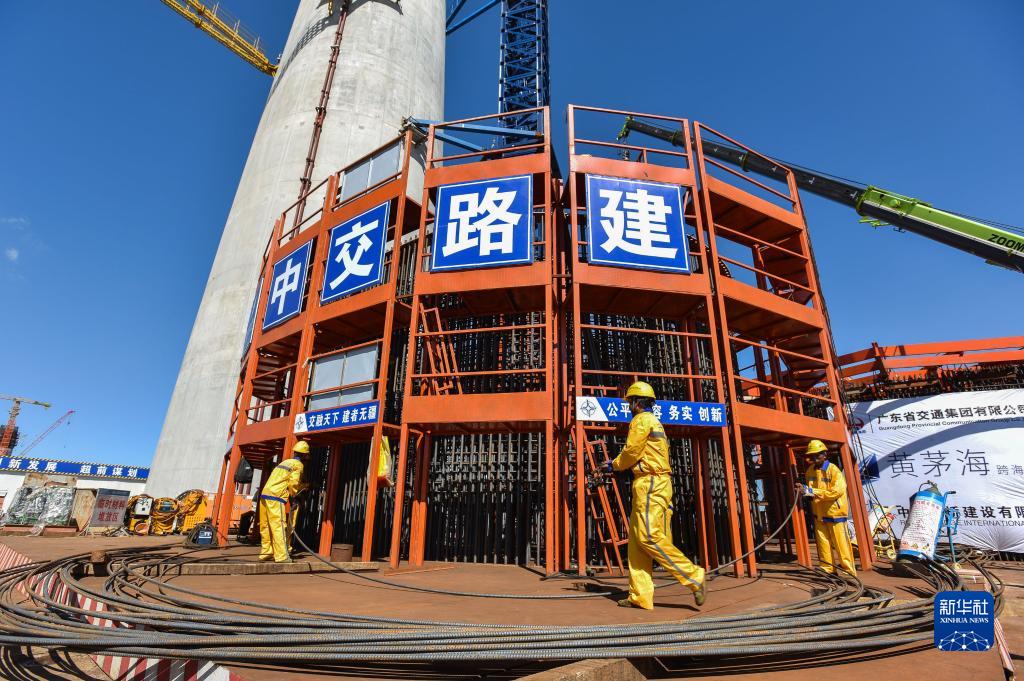 2023年1月9日,高欄港大橋東主塔在跨海通道大橋5座主塔中率先封頂。2023年6月19日,中交路建黃茅??绾Mǖ理椖坎吭诤V?座主塔率先完成首榀鋼箱梁架設,標志著(zhù)項目轉入上部結構施工階段。
