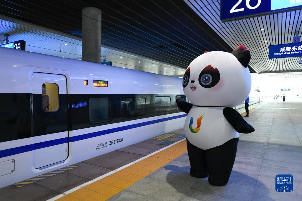 7月1日,從成都東站開(kāi)往香港西九龍站的G2963次列車(chē)發(fā)車(chē)時(shí),第31屆世界大學(xué)生夏季運動(dòng)會(huì )吉祥物“蓉寶”人偶在成都東站站臺和乘客告別。