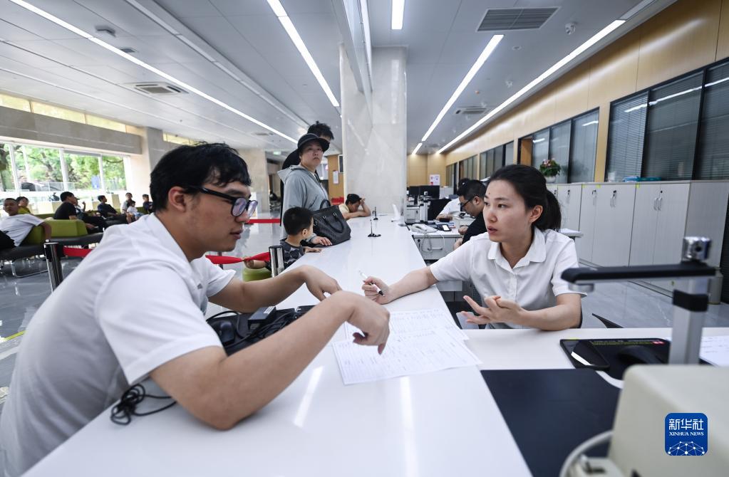 7月3日,在諸暨市店口鎮便民服務(wù)中心內,企業(yè)負責人(左)在辦理立項審批業(yè)務(wù)。