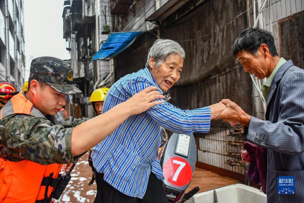 7月4日,在重慶市萬(wàn)州區五橋街道,武警重慶總隊船艇支隊官兵在轉移受困群眾。