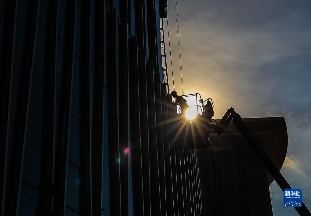 建設者在國際金融論壇(IFF)永久會(huì )址進(jìn)行幕墻施工(7月10日攝)。