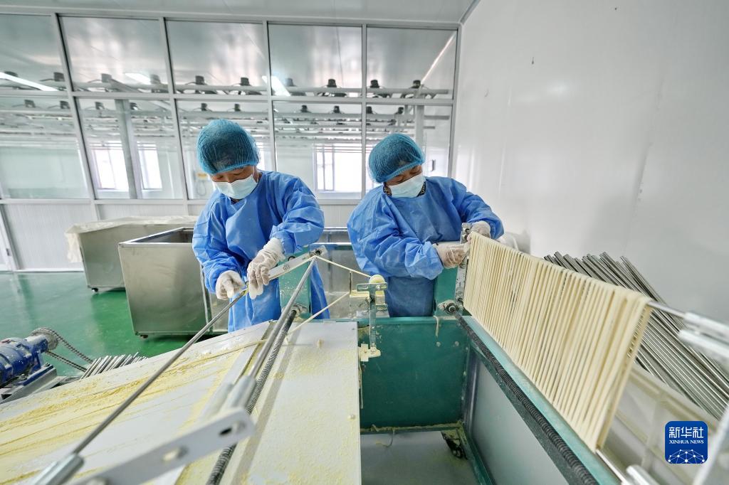 7月11日,河北省遷安市野雞坨鎮丁莊子村一家食品生產(chǎn)企業(yè)的工人在空心掛面生產(chǎn)線(xiàn)上工作。