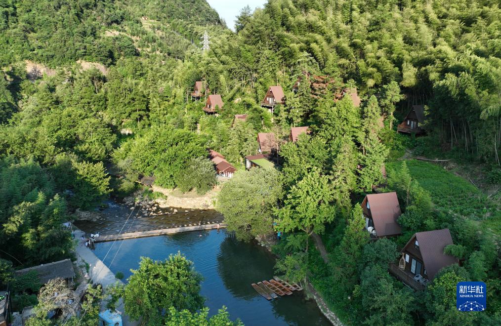 7月11日,人們在杭州臨安高虹鎮江南秘境游玩(無(wú)人機照片)。