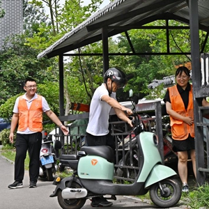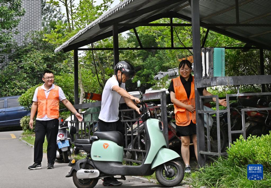 7月11日,青島膠州市少海瀾山小區工作人員引導居民將電動(dòng)自行車(chē)停進(jìn)集中充電點(diǎn)。