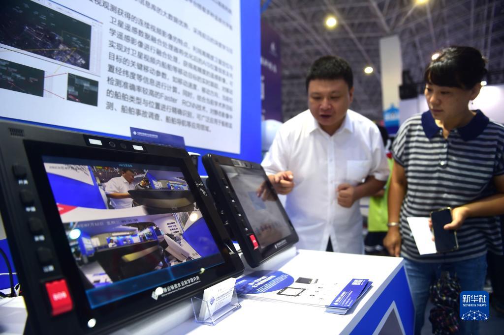 7月12日,參展單位工作人員(左)向參觀(guān)者介紹新一代多功能北斗船載智能終端設備。