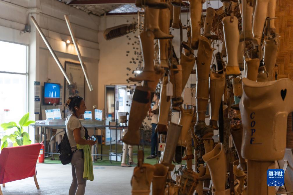 7月11日,一名女子在老撾首都萬(wàn)象“義肢與矯形合作事業(yè)”展館參觀(guān)老撾未爆彈受害者康復服務(wù)展。