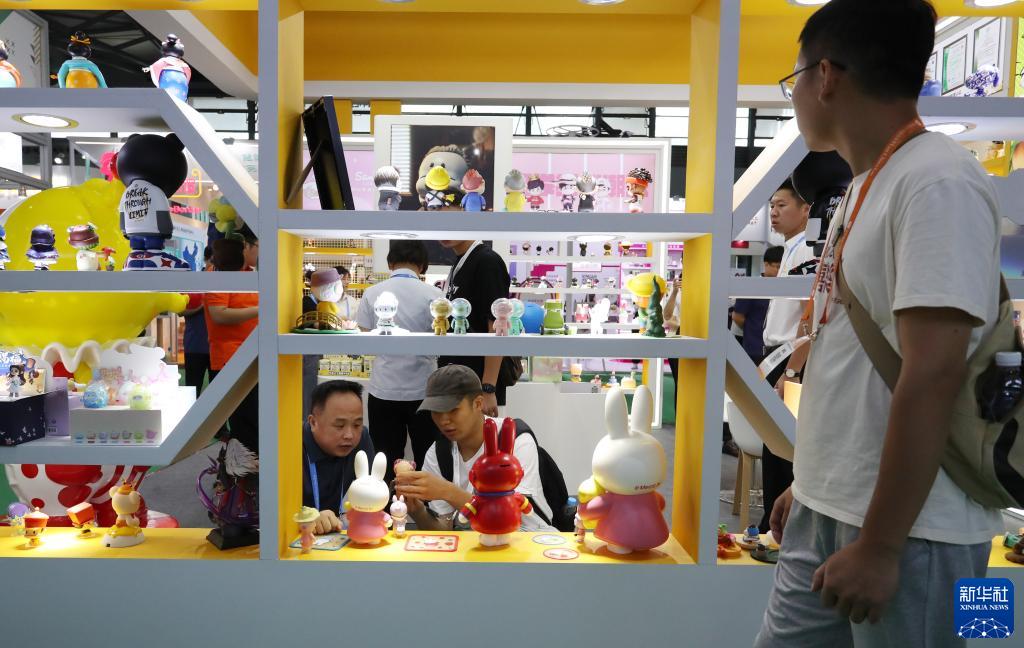 7月12日,參觀(guān)者在一個(gè)玩具企業(yè)展臺內交流討論。