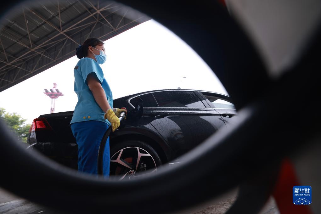7月12日,河北省內丘縣一家加油站的工作人員為汽車(chē)加油。