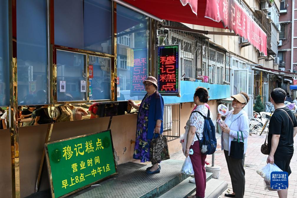 7月10日,市民在天津西北角一家還未開(kāi)門(mén)的店鋪前排隊等待。