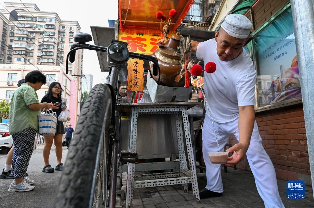 7月11日,在天津西北角歡慶西胡同,商家在制作老味茶湯。