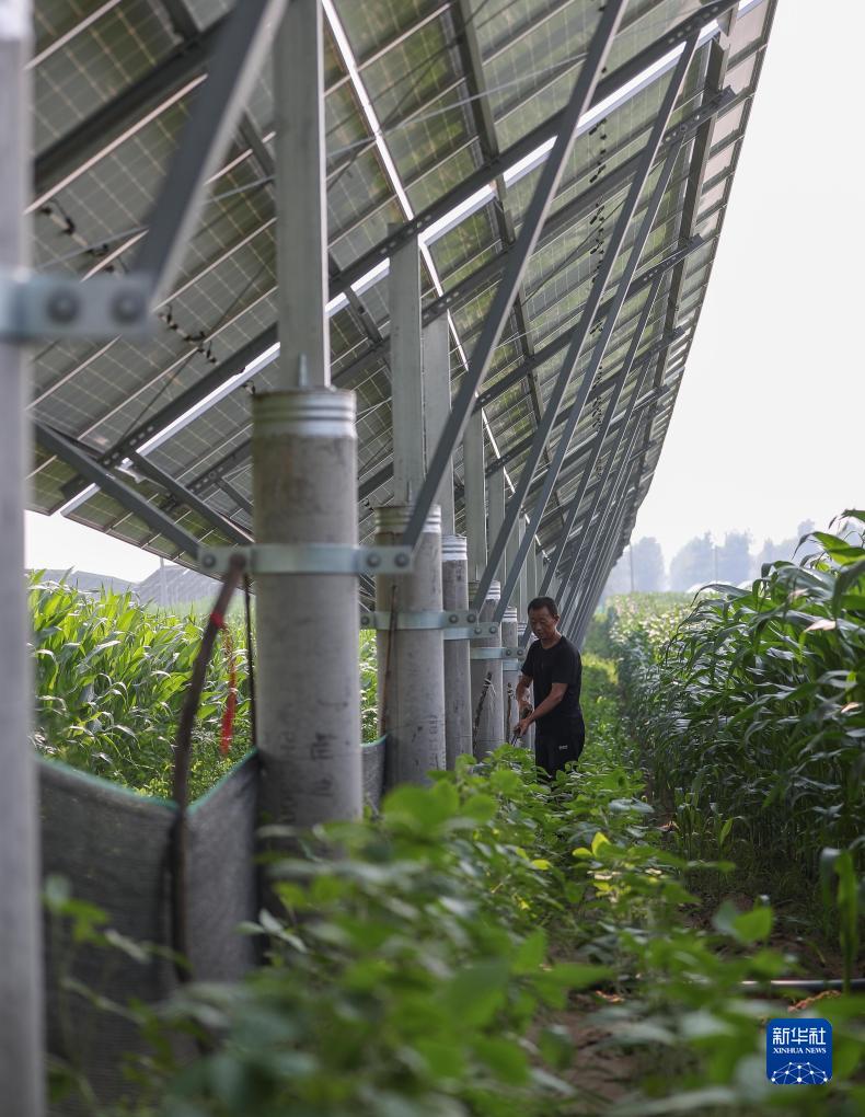 7月11日,在遼寧省彰武縣馮家鎮哈大冷村,村民為太陽(yáng)能光伏電板下方的作物除草。